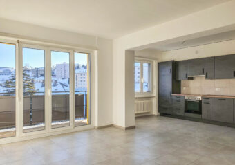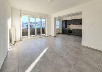 Cuisine agencée ouverte sur le séjour avec balcon, 1 chambre, salle de bains avec douche / WC, réduit / buanderie, hall d’entrée avec armoires.